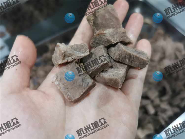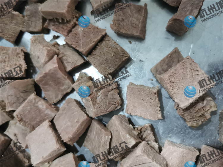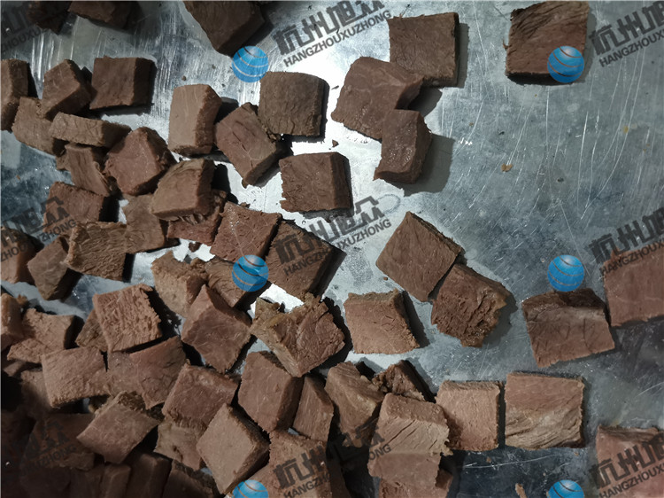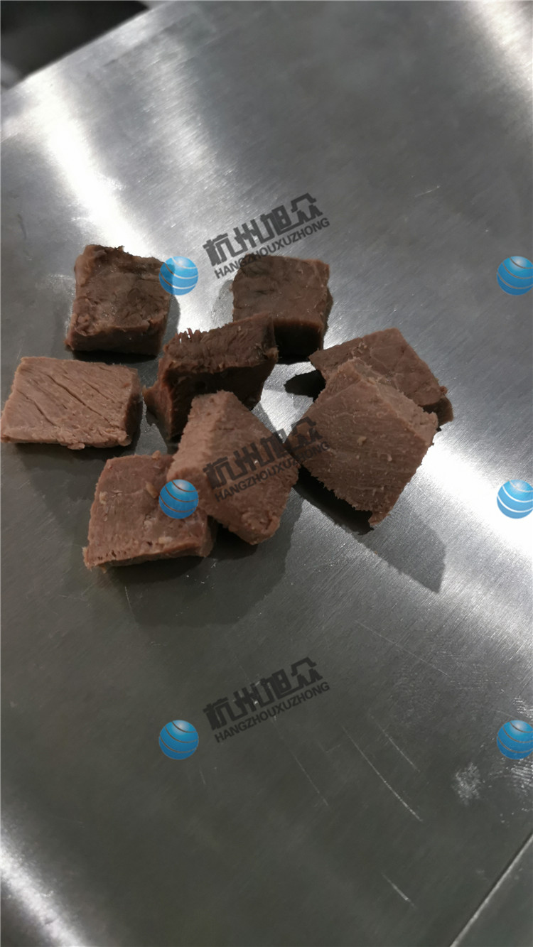今日客户自带熟牛肉亲自来厂试机看效果,用切丁机切熟牛肉丁,看看效果如何吧!